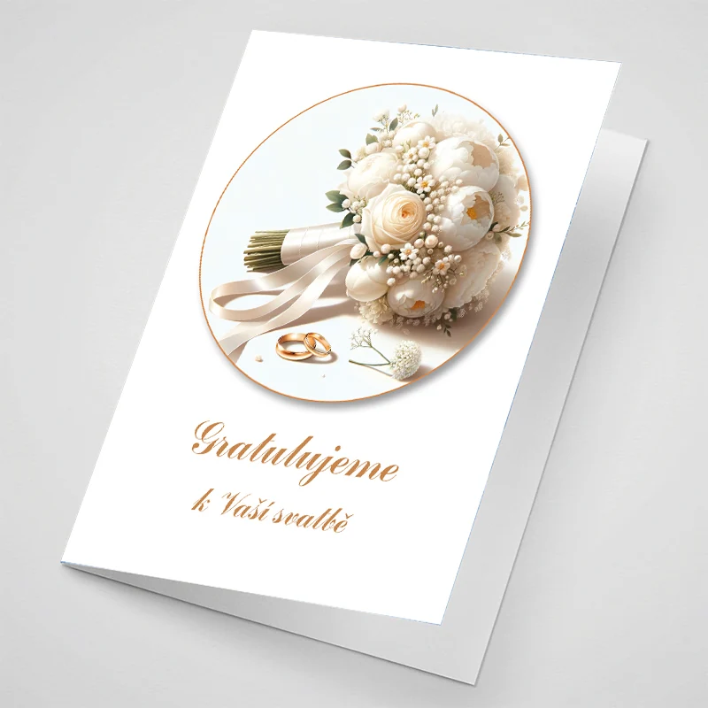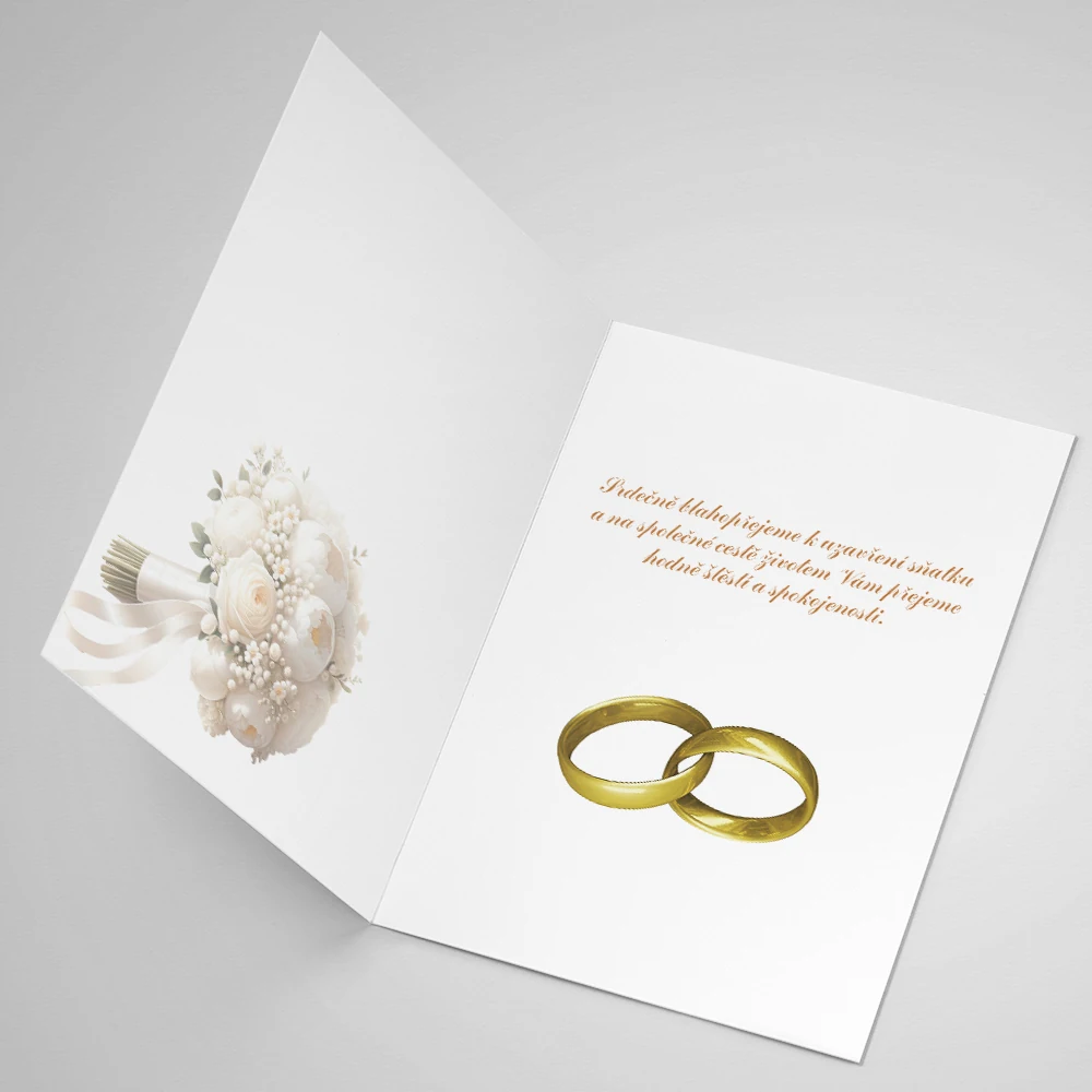 Otevírací blahopřání k svatbě ve formátu A6, potažené lesklým laminem, možnost doplnit či změnit text uvnitř blahopřání. K blahopřání lze objednat i obálky.