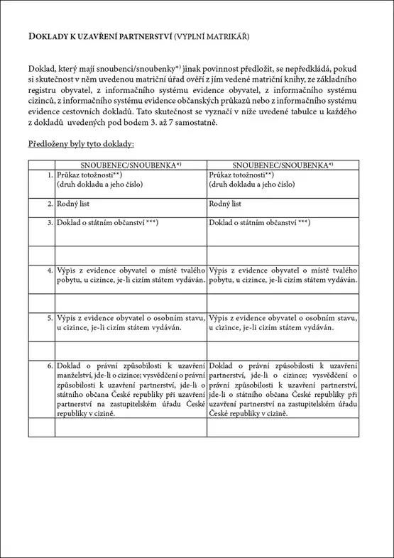 Strukturovaný dotazník obsahuje všechny otázky požadované zákonem o registrovaném partnerství pro zjištění osobních údajů a ověření zákonných podmínek. Formulář je určen pro matriční úřady při přípravě registrace partnerství.