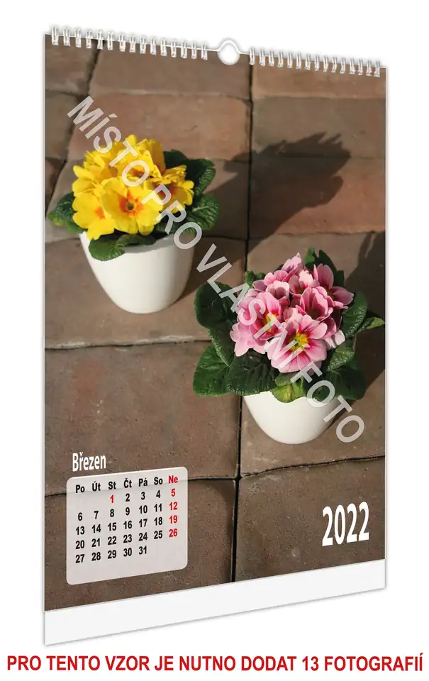 Nástěnný měsíční kalendář o velikosti A4 nebo A3 z Vámi dodaných fotografií je tištěn na kvalitním 200g křídovém papíře a šitý TWIN-WIRE bílou spirálou. Podklad kalendáře tvoří kašírovaná lepenka. Kalendář má 13 jednostranně potištěných listů a je potřeba na něj dodat 13 fotografií.