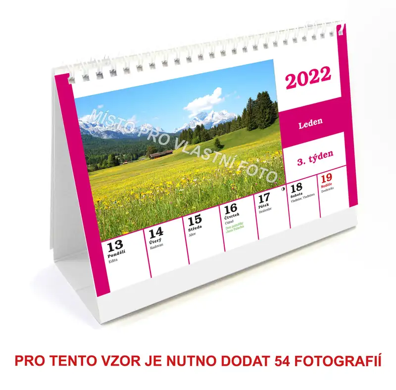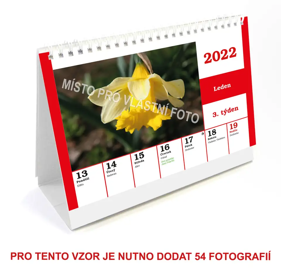 Stolní týdenní kalendář z Vámi dodaných fotografií, o šířce 19,5 cm a výšce 14 cm, je tištěn na kvalitním křídovém papíře a šitý bílou TWIN-WIRE spirálou po celé délce kalendáře. Stojánek složený do tvaru A je z kvalitní oboustranně kašírované lepenky. Kalendář má 56 stran a je potřeba na něj dodat alespoň 54 fotografií (53 fotografií k jednotlivým týdnům a další na titulní stranu).
