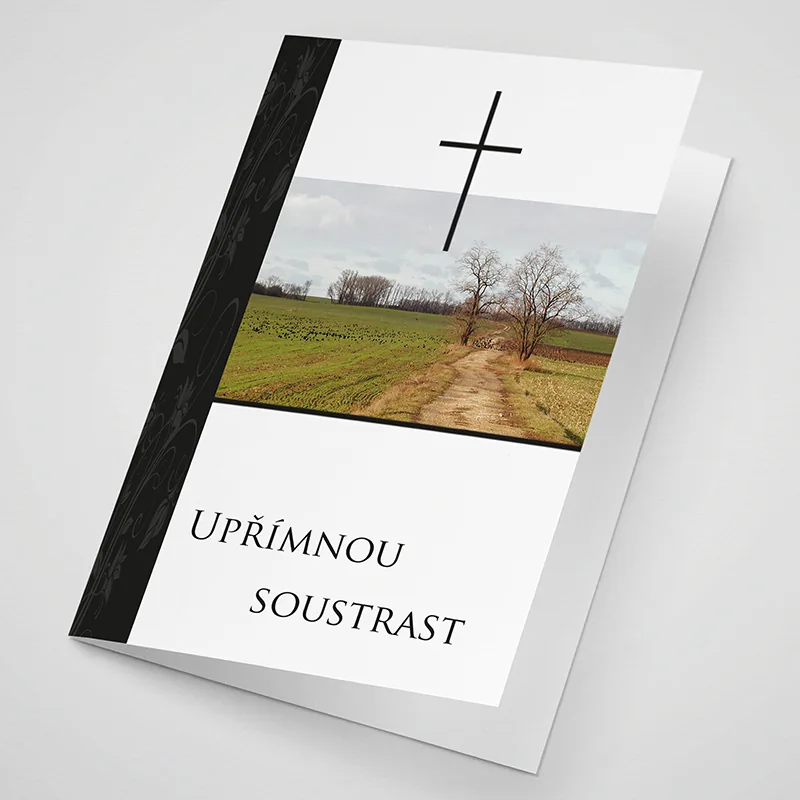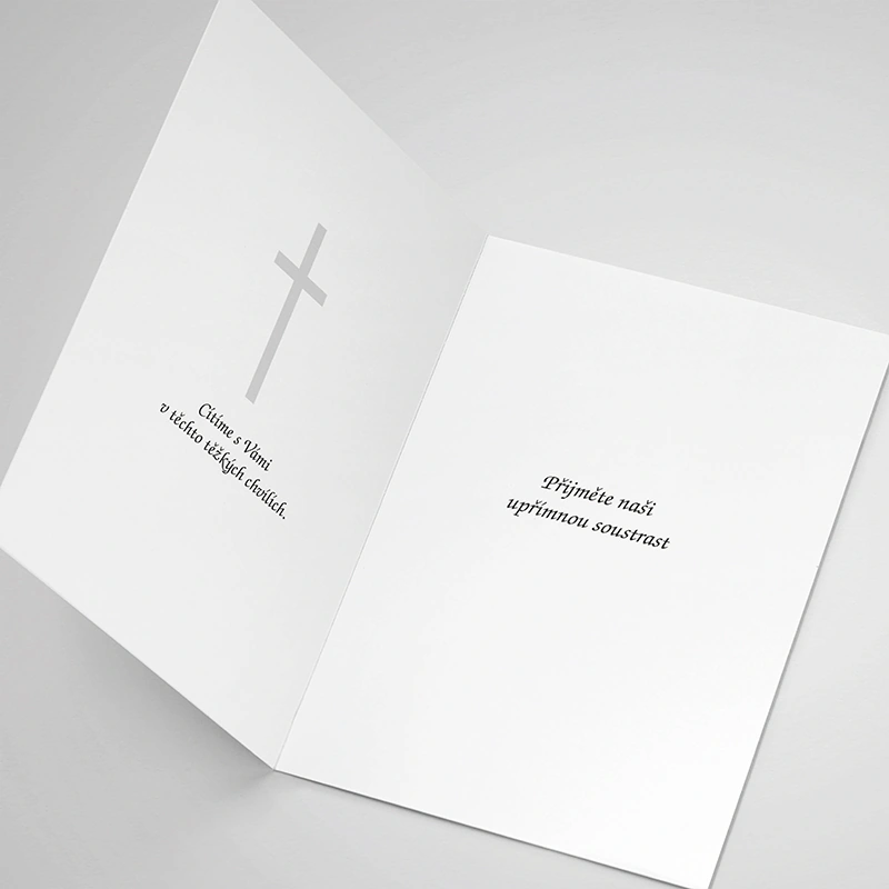 Otevírací kondolence o velikosti A6 (formát do klasické obálky), potažená lesklým laminem, možnost doplnit text uvnitř kondolence.