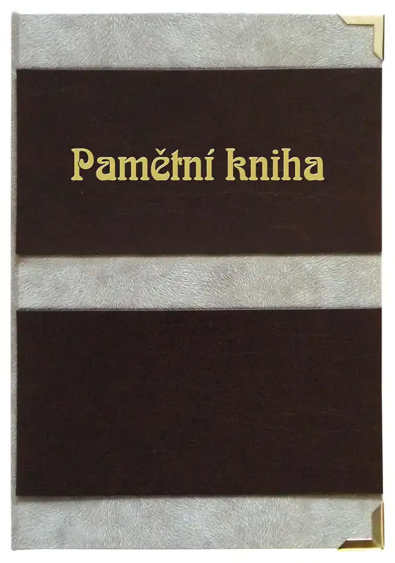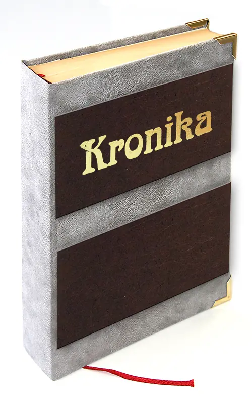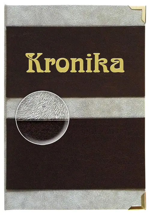 Ručně vázaná kronika, velikost A4, obal z imitace kůže a prolisované látky, 216 listů, dvojitý kapitálek, ořízka, stužková záložka, ražená předsádka, zlatá ražba, 4x vsazená deska, 4x ozdobný zlatý roh. Na přední desky je možno doplnit vlastní text.