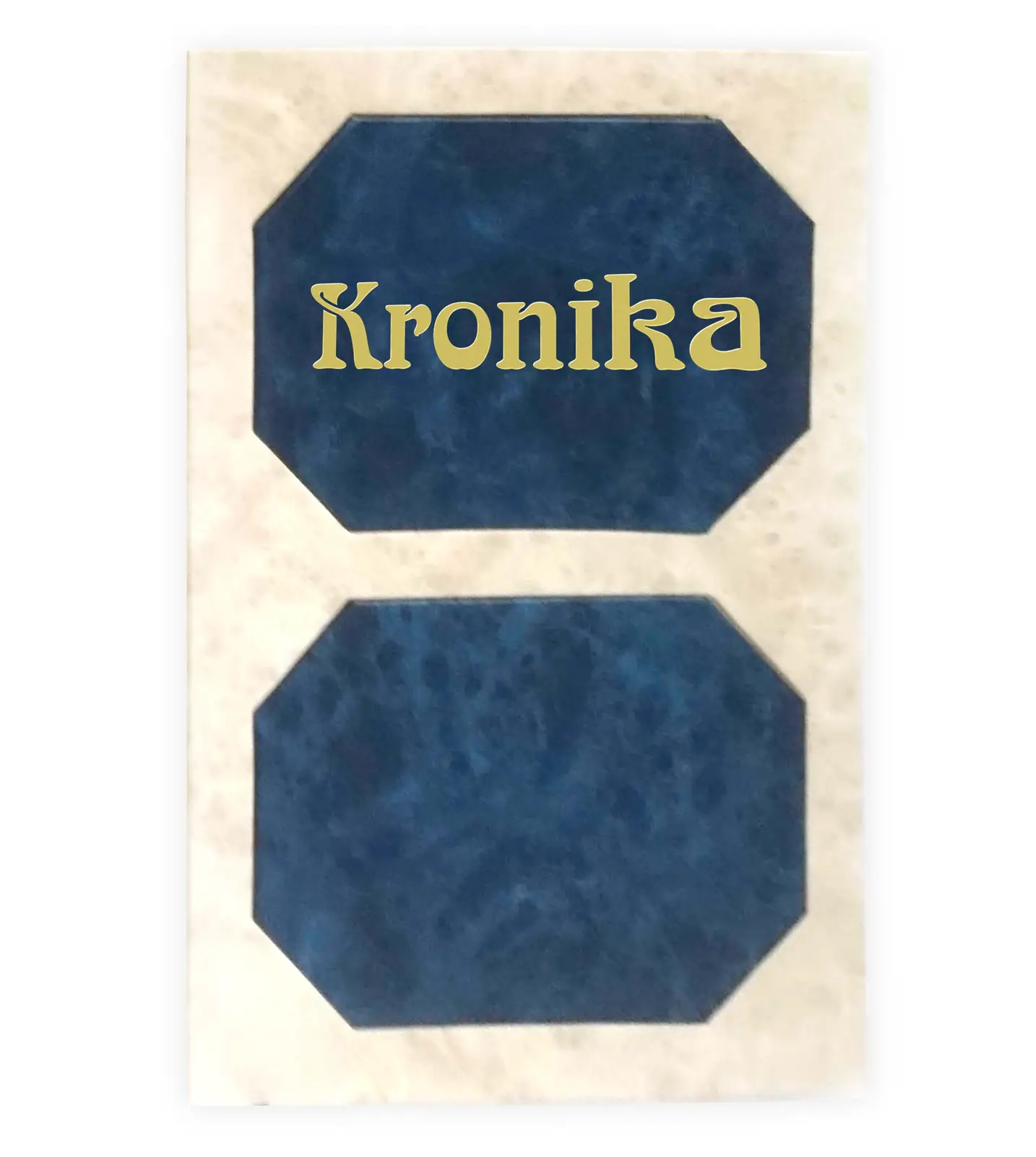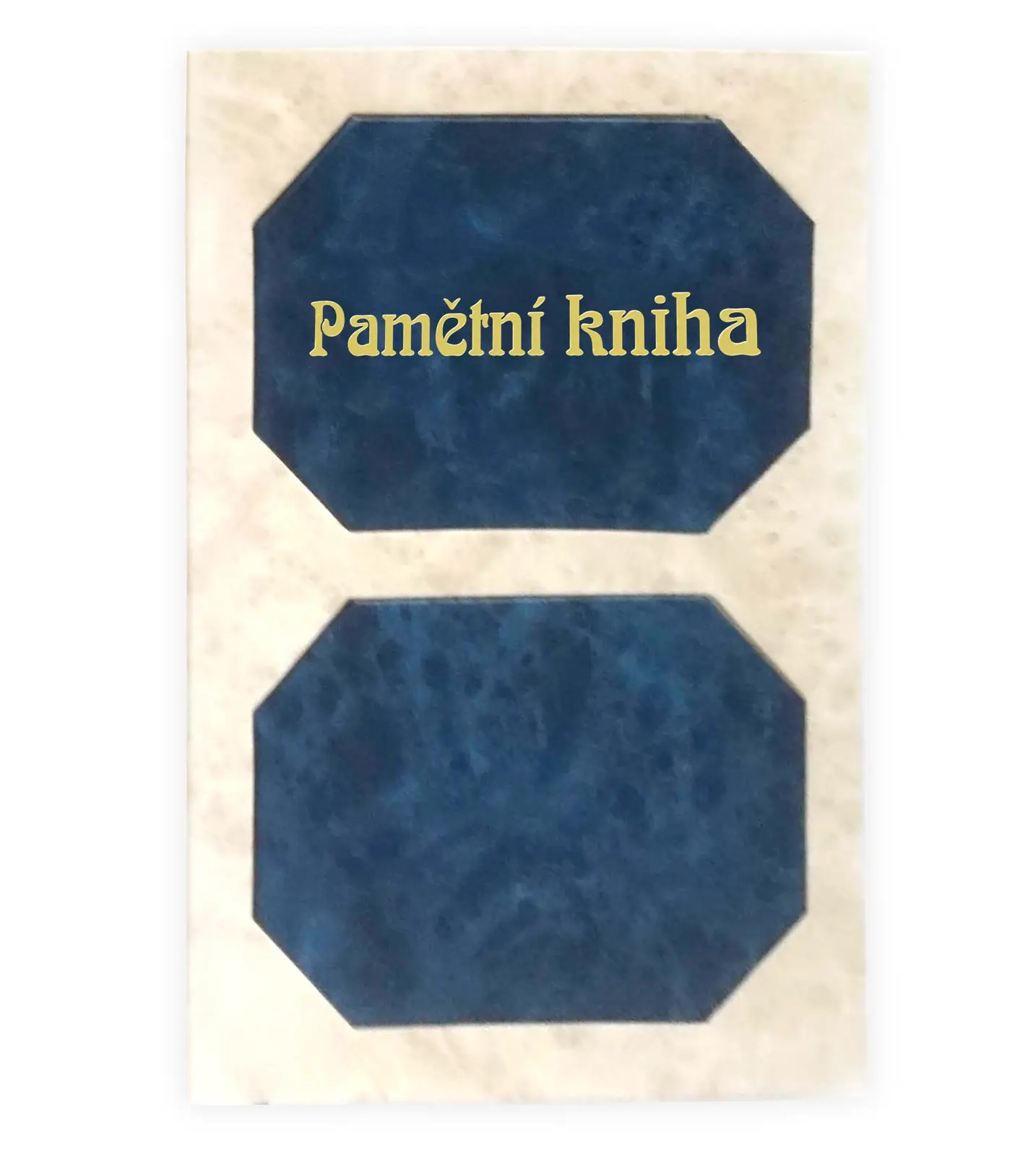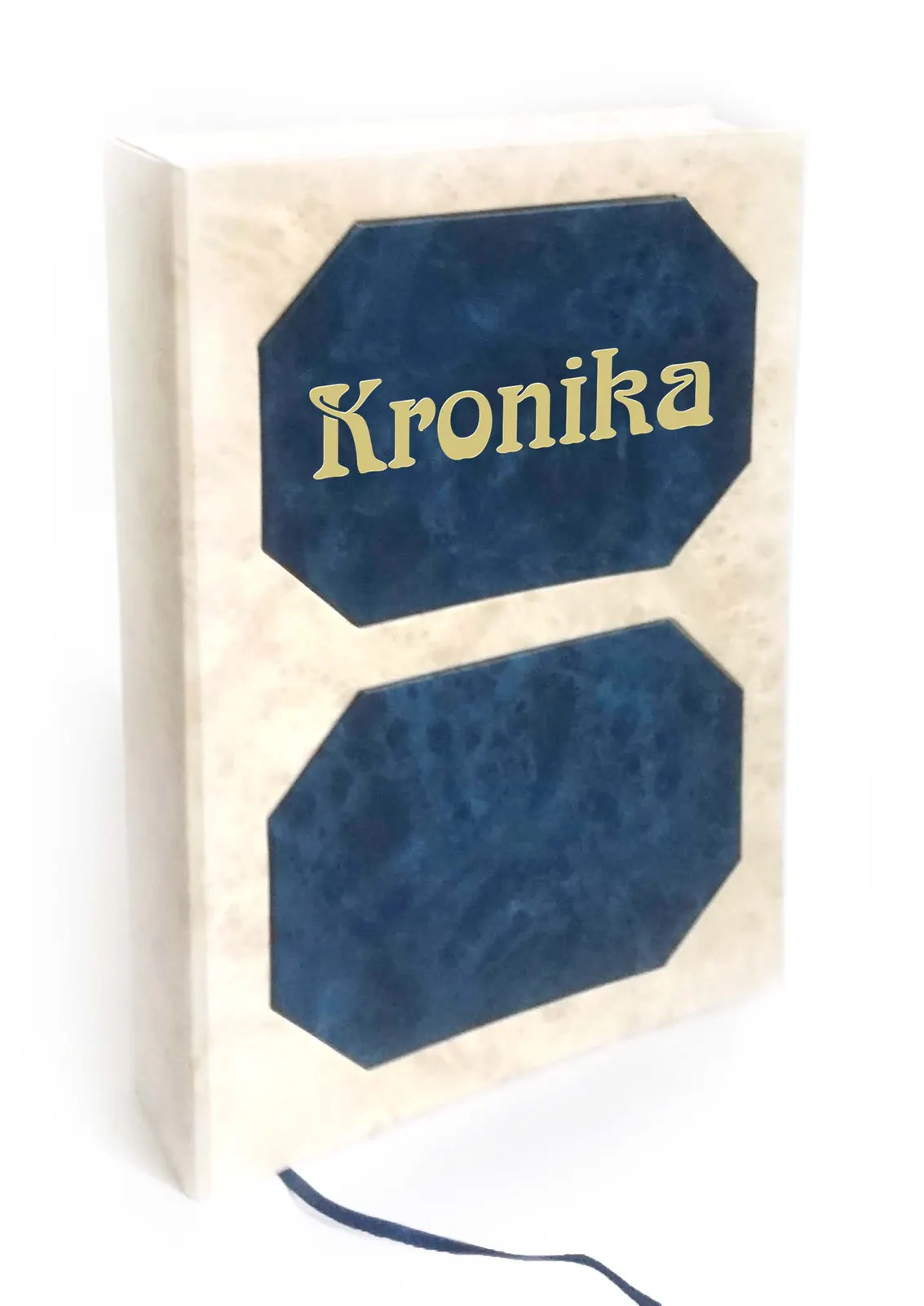 Ručně vázaná kronika, velikost A4, obal z imitace kůže a prolisované látky, 216 listů, dvojitý kapitálek, ořízka, stužková záložka, ražená předsádka, zlatá ražba, 2x vsazená deska. Na přední desky je možno doplnit vlastní text.