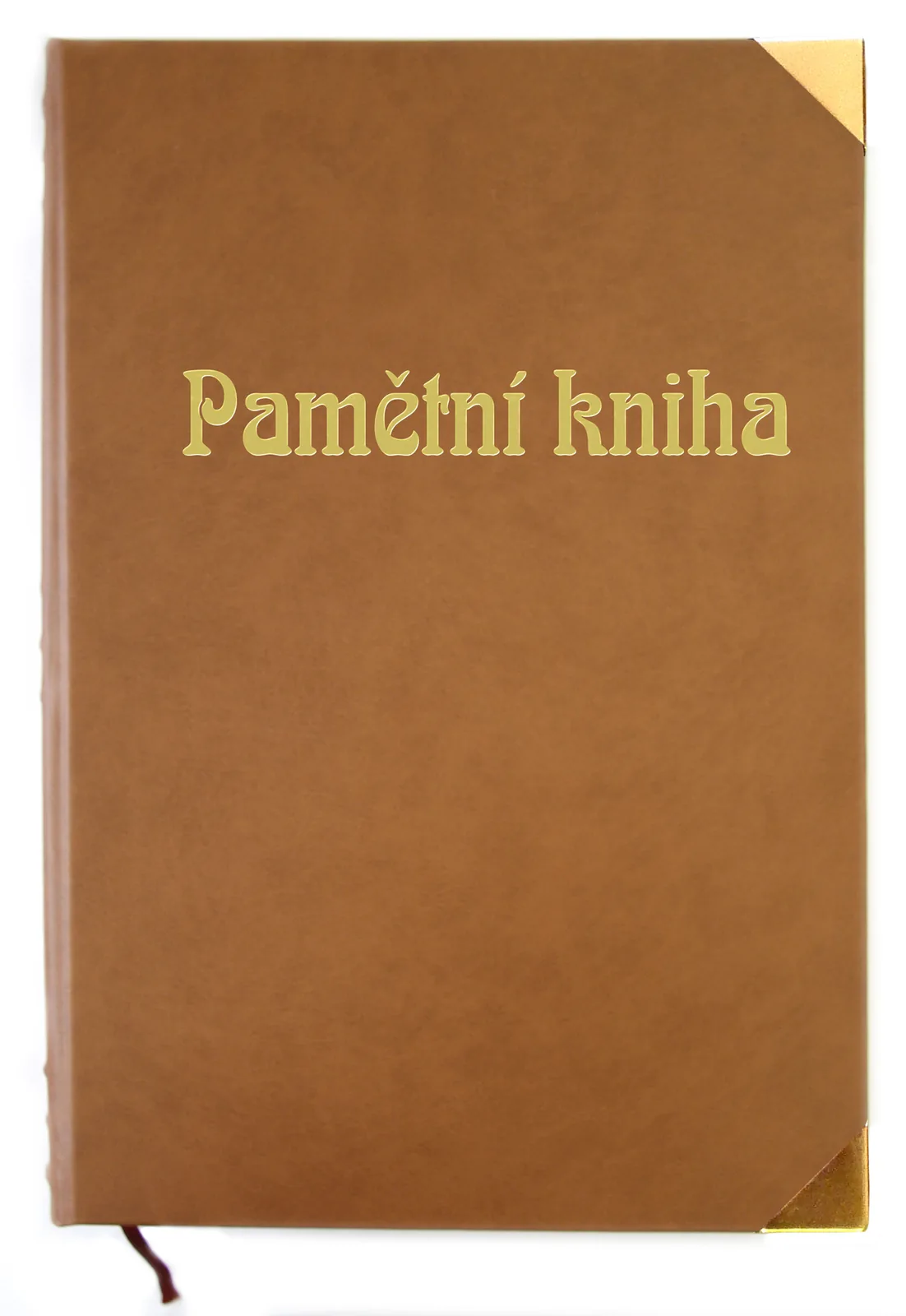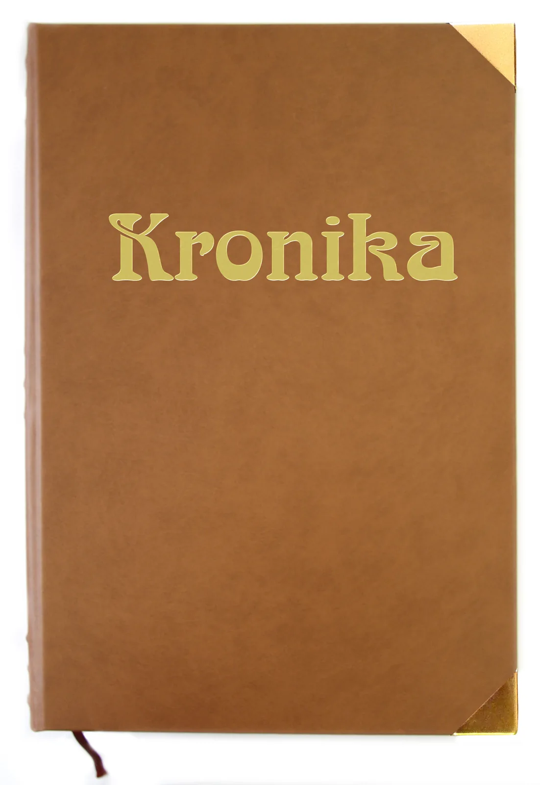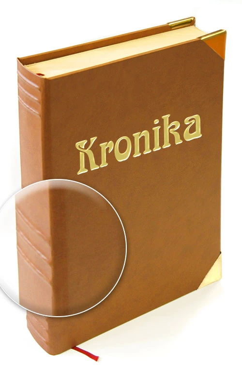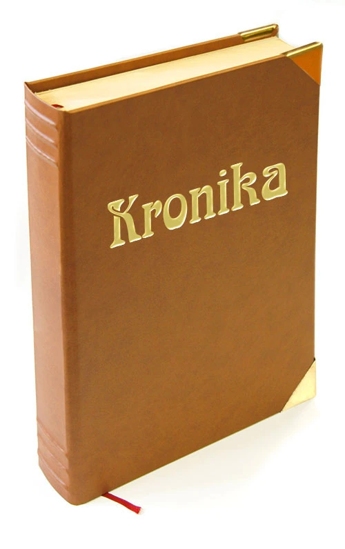 Ručně vázaná kronika, velikost A4, obal z imitace kůže, 216 listů, dvojitý kapitálek, ořízka, stužková záložka, vazy ve hřbetu, ražená předsádka, zlatá ražba. Na přední desky je možno doplnit vlastní text.
