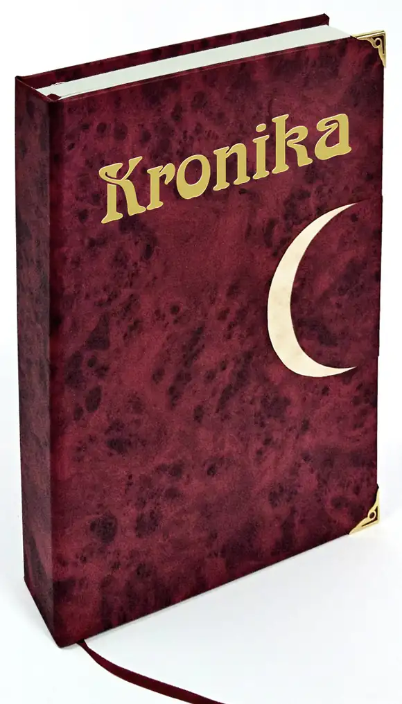Ručně vázaná kronika, velikost A4, obal z imitace kůže, 216 listů, dvojitý kapitálek, stužková záložka, ražená předsádka, zlatá ražba, zlaté rohy. Na přední desky je možno doplnit vlastní text.