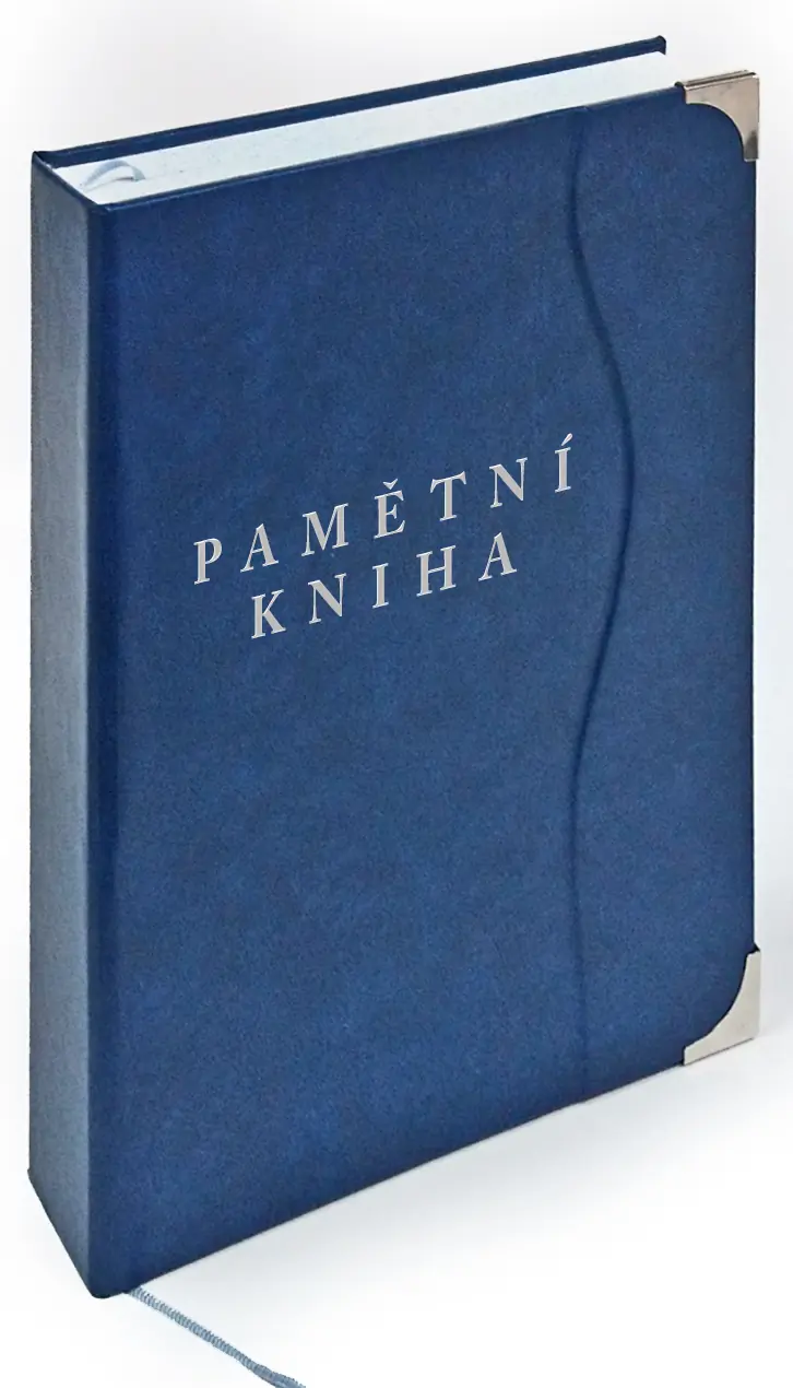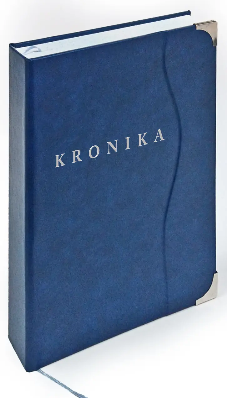 Ručně vázaná kronika, velikost A4, obal z imitace kůže, 216 listů, dvojitý kapitálek, stužková záložka, ražená předsádka, stříbrná ražba, stříbrné rohy. Na přední desky je možno doplnit vlastní text.