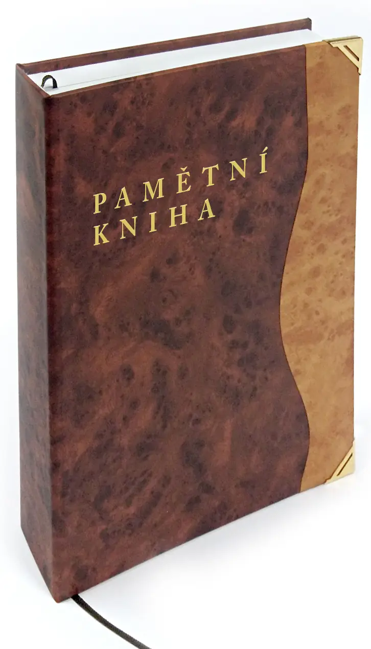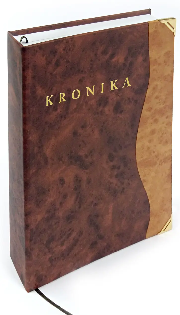 Ručně vázaná kronika, velikost A4, obal z imitace kůže, 216 listů, dvojitý kapitálek, stužková záložka, ražená předsádka, zlatá ražba, zlaté rohy. Na přední desky je možno doplnit vlastní text.