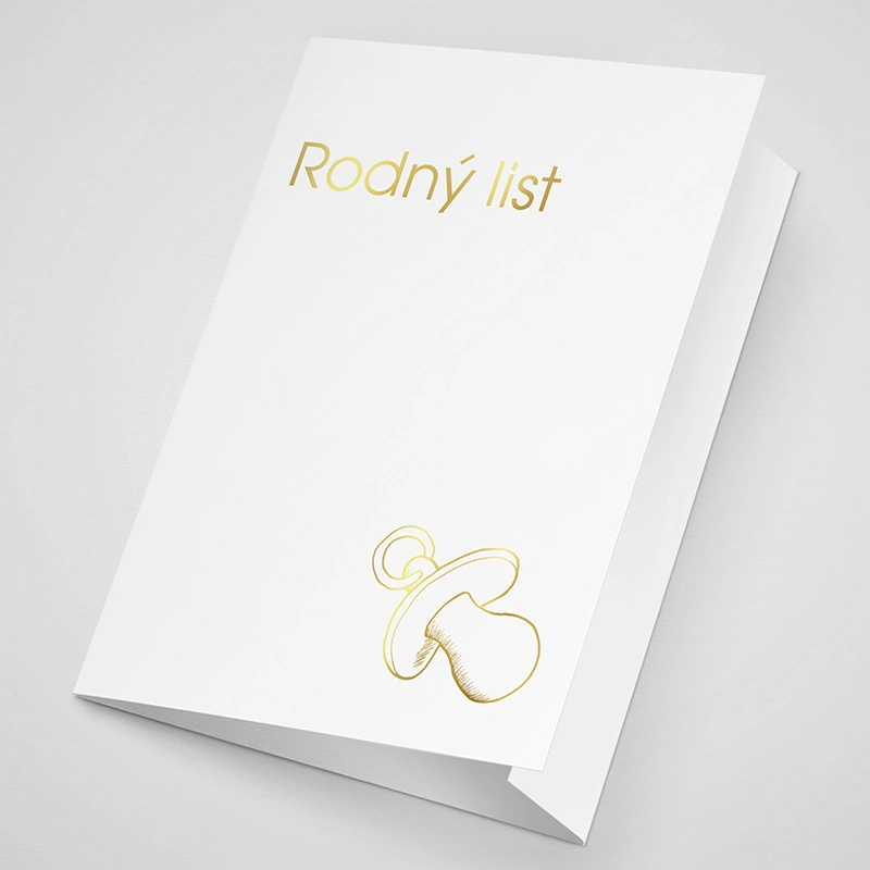 Pevný papírový obal A5 na rodný list se zlatotiskem, s jednou klopou. Na obal lze doplnit název obce či města.