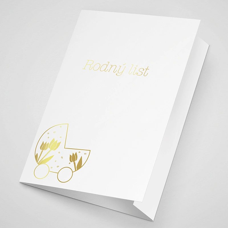 Pevný papírový obal A5 na rodný list se zlatotiskem, s jednou klopou. Na obal lze doplnit název obce či města.