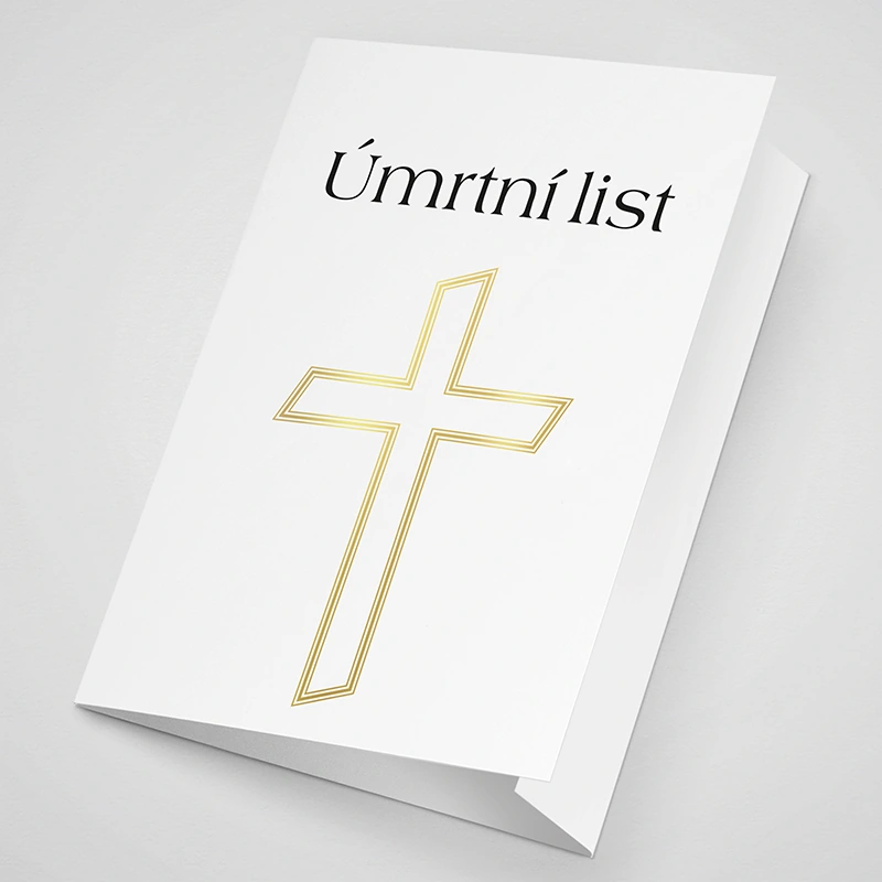 Pevný papírový obal A5 na úmrtní list se zlatotiskem, s jednou klopou. Na obal lze doplnit název obce či města.