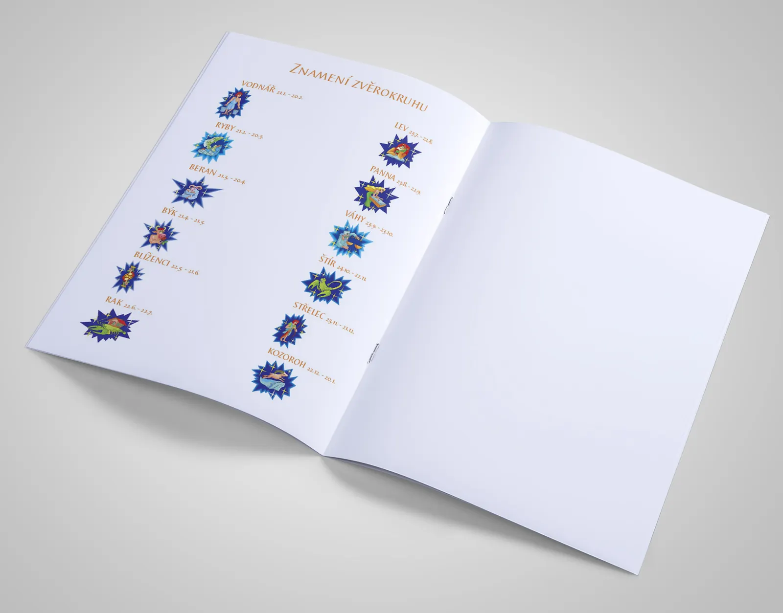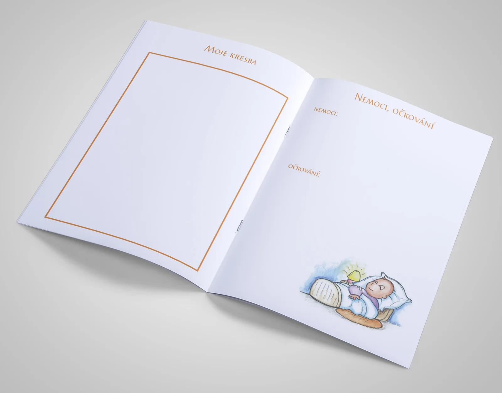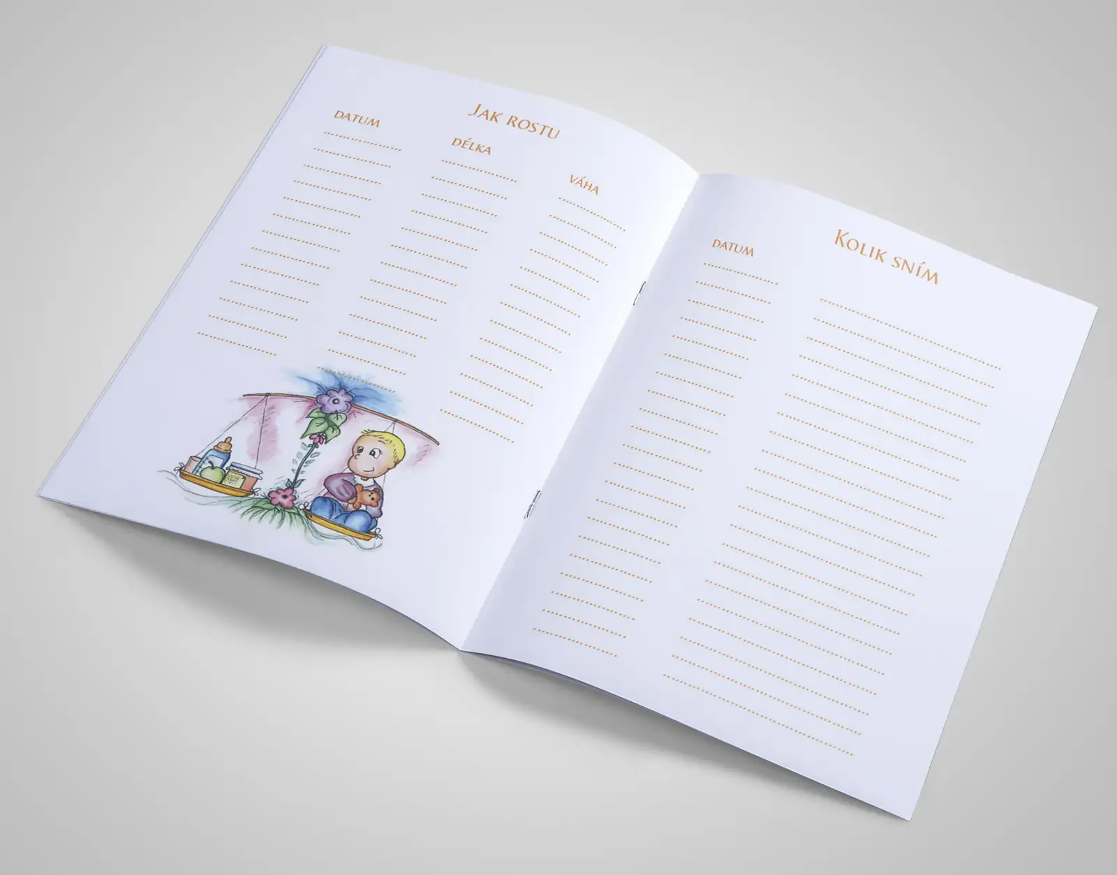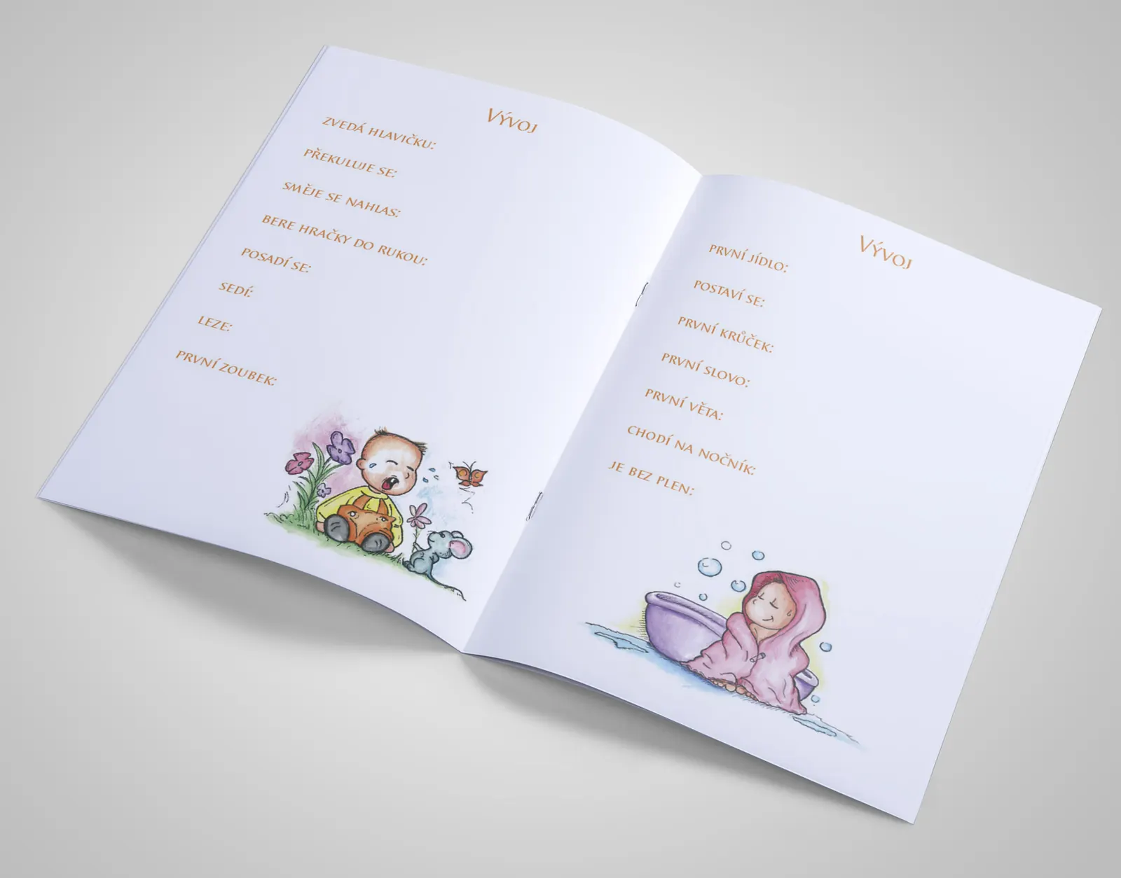 Brožura formátu A5 s 20 stranami spojenými kvalitní sponou. Barevný tisk na kvalitním papíru s roztomilou ilustrací miminka pod květinou na obálce.