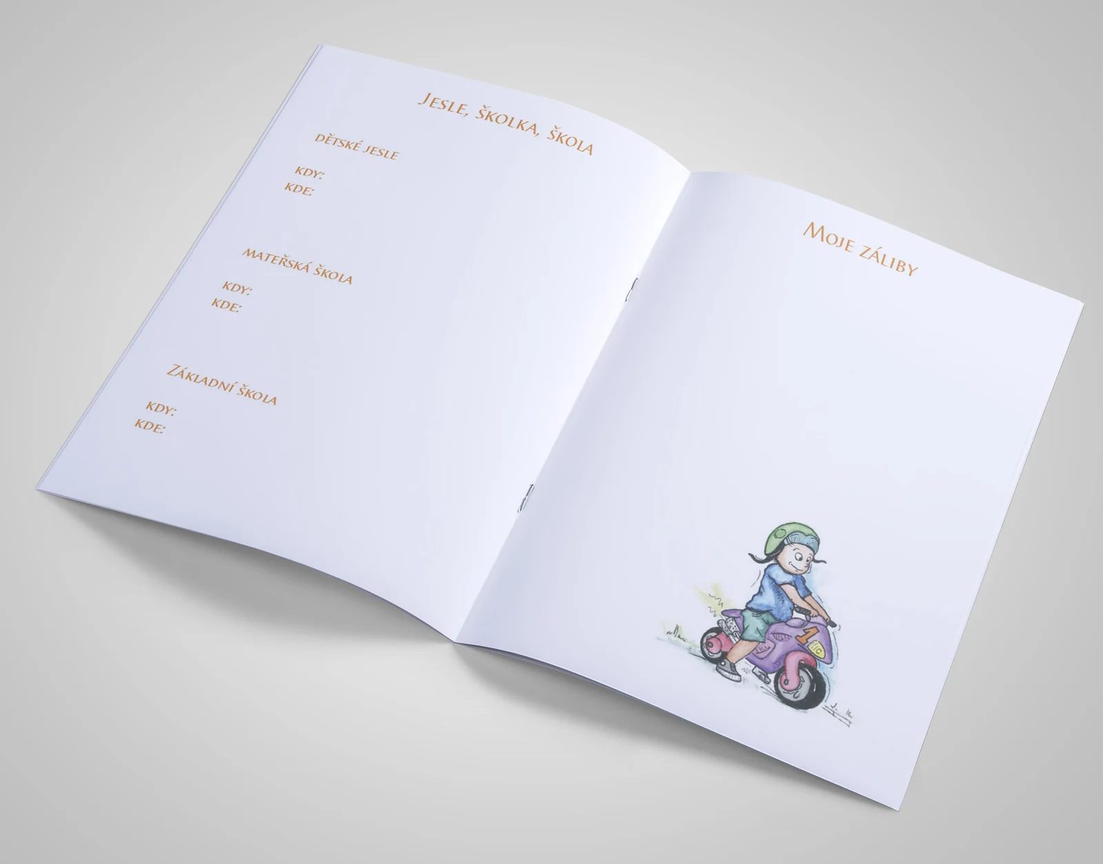 Předtištěné stránky poskytují prostor pro zachycení všech důležitých momentů dětství – od prvních vývojových milníků, přes zdravotní záznamy, oblíbené věci až po záliby dítěte. Struktura brožury provází rodiče jednotlivými etapami vývoje.