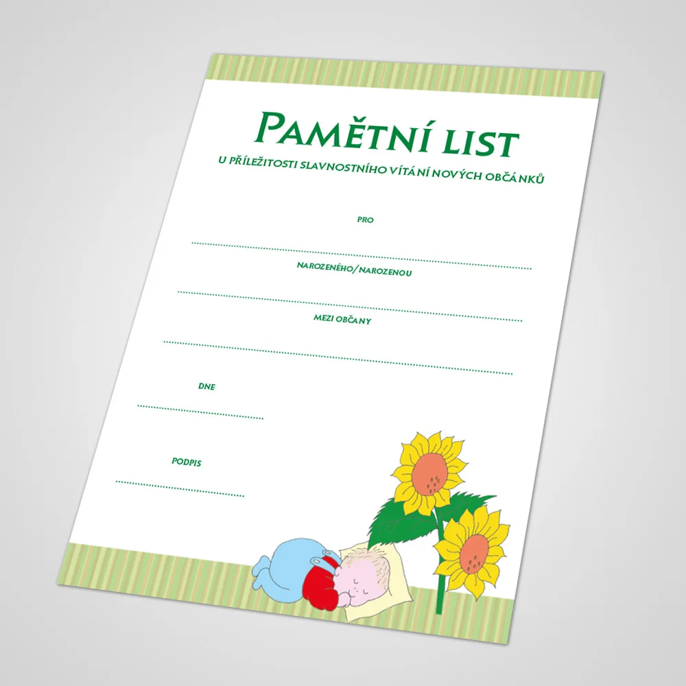 Pamětní list formátu A4 tištěný na kvalitní ofsetový papír 250g