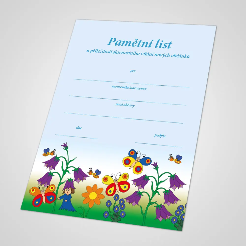 Pamětní list formátu A4 tištěný na kvalitní ofsetový papír 250g