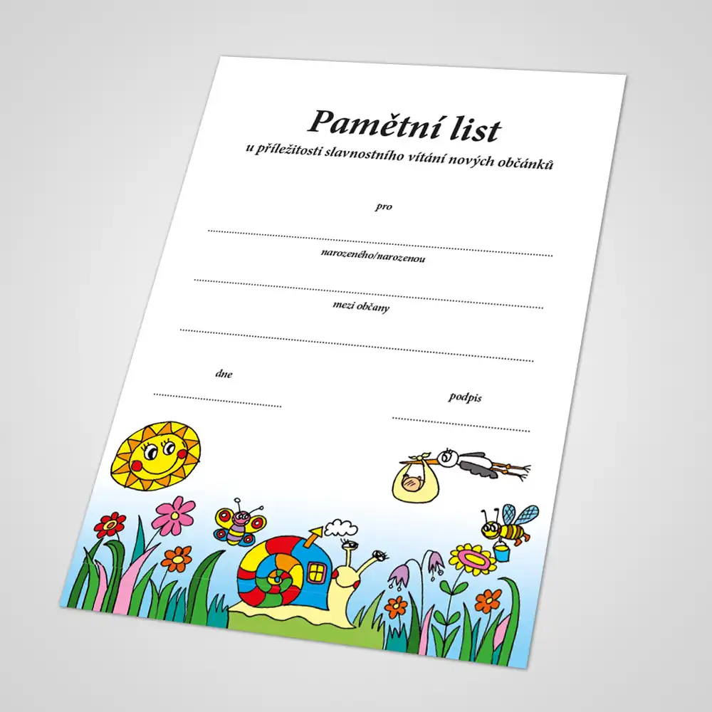 Pamětní list k příležitosti slavnostního vítání nových občánků jako trvalá památka na tento významný okamžik v životě dítěte a obce.