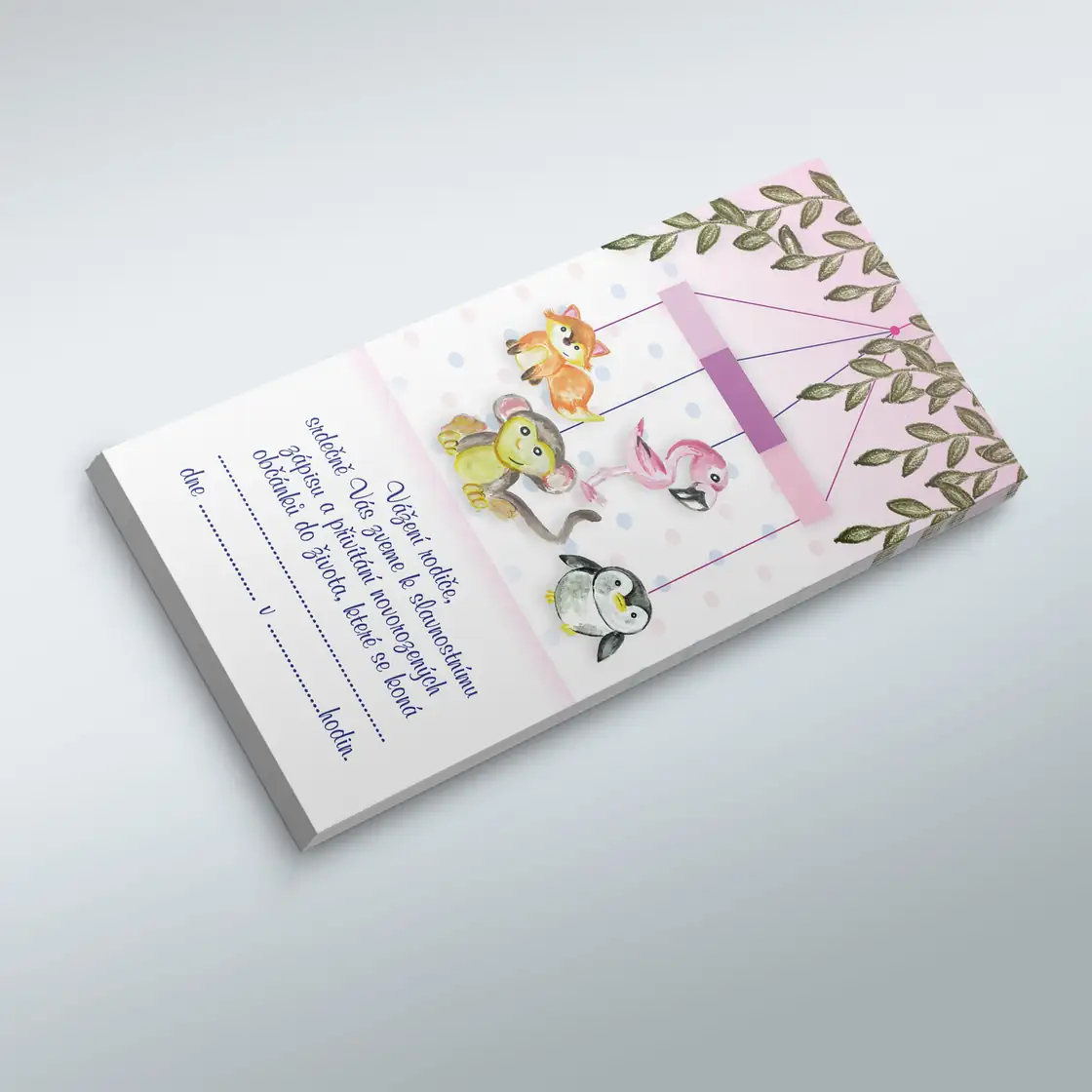 Pozvánky jsou tištěny na kvalitní 250g ofsetový papír, formát do podlouhlé obálky. Možnost doplnit či změnit text pozvánky.