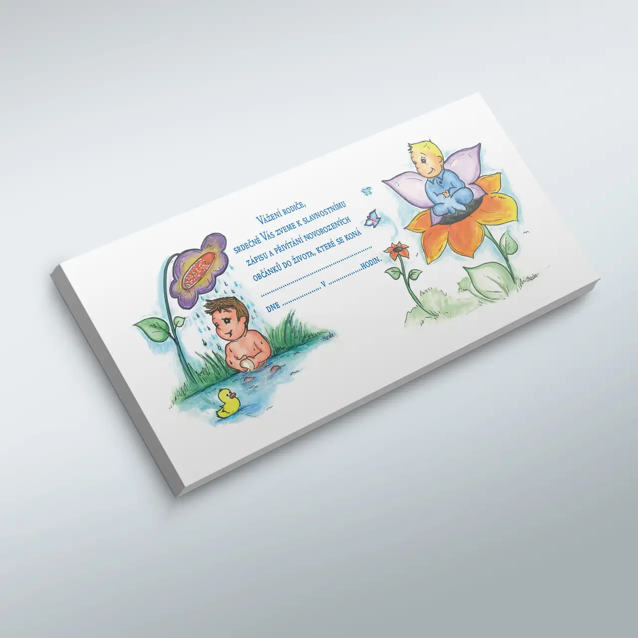 Pozvánky jsou tištěny na kvalitní 250g ofsetový papír, formát do podlouhlé obálky. Možnost doplnit či změnit text pozvánky.