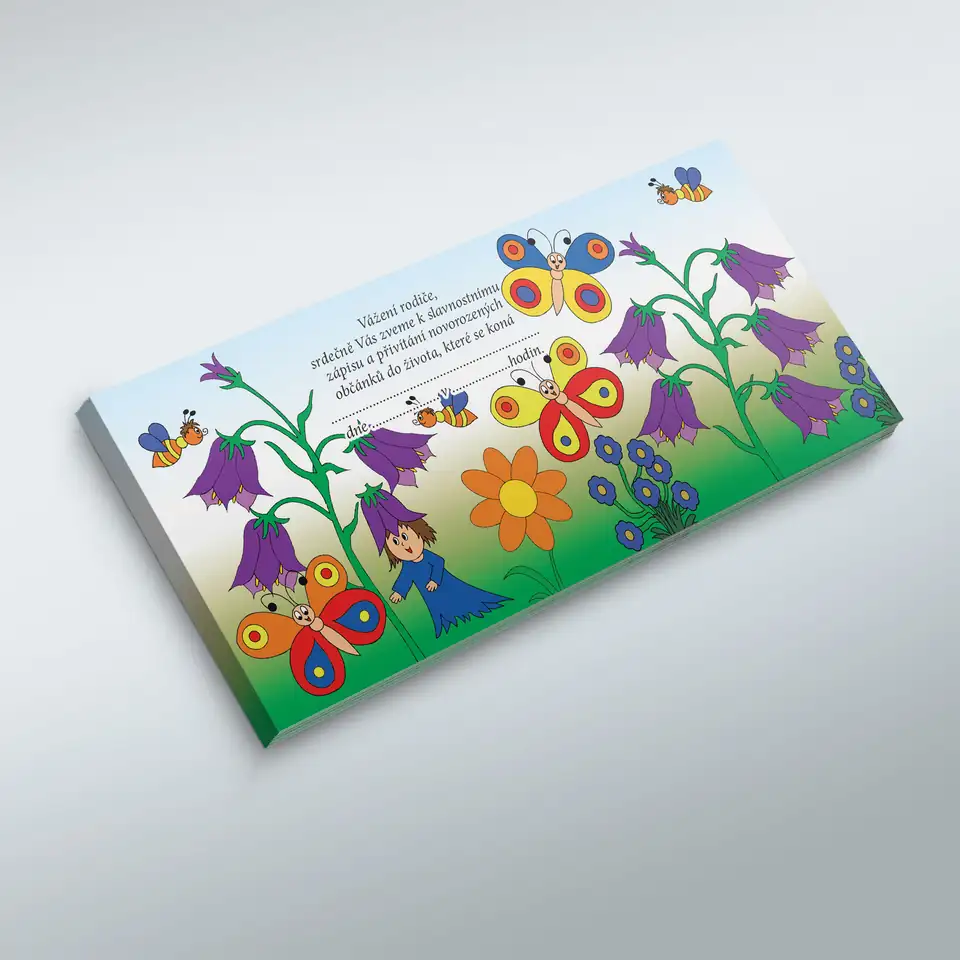 Pozvánky jsou tištěny na kvalitní 250g ofsetový papír, formát do podlouhlé obálky. Možnost doplnit či změnit text pozvánky.