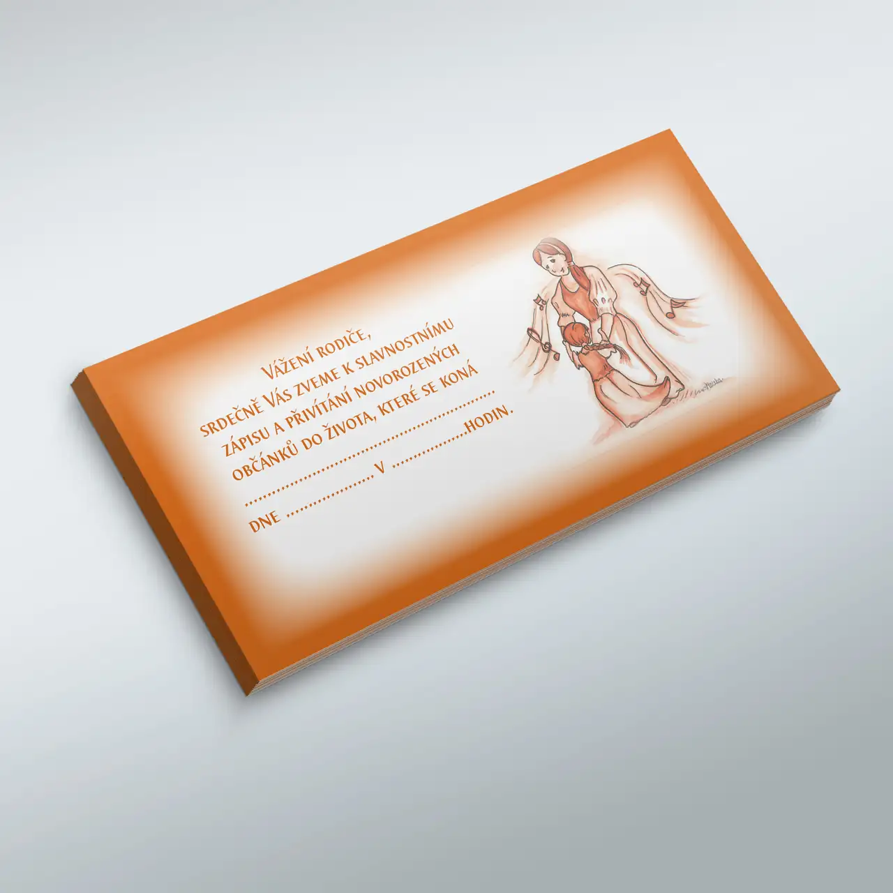 Pozvánky jsou tištěny na kvalitní 250g ofsetový papír, formát do podlouhlé obálky. Možnost doplnit či změnit text pozvánky.