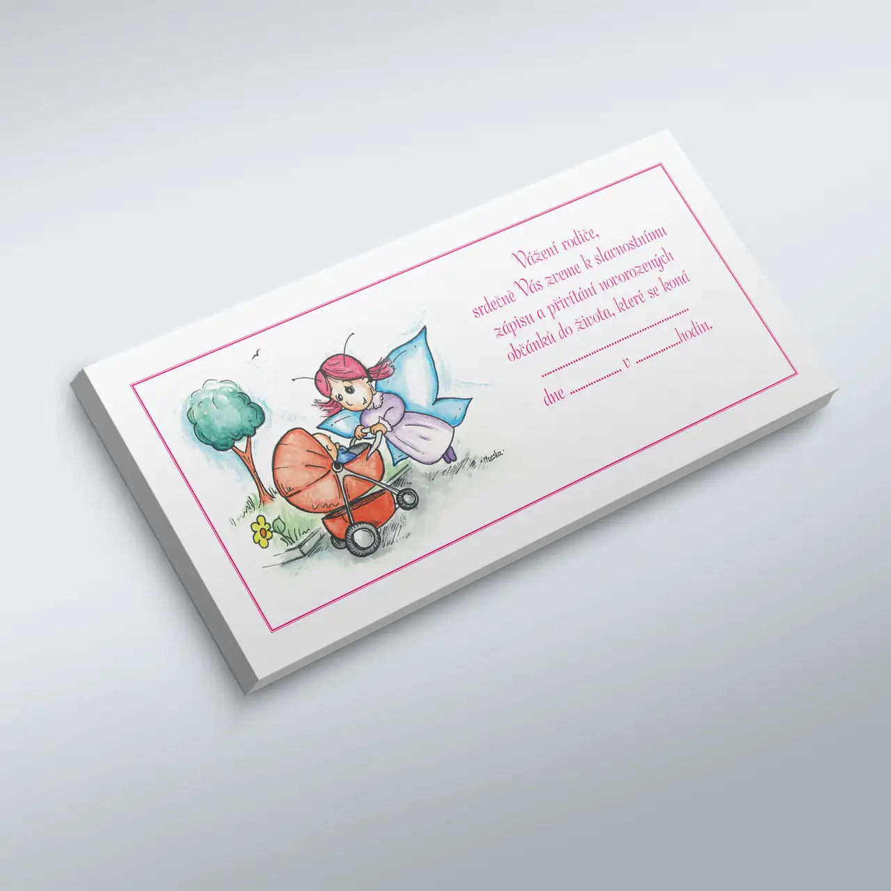 Pozvánky jsou tištěny na kvalitní 250g ofsetový papír, formát do podlouhlé obálky. Možnost doplnit či změnit text pozvánky.